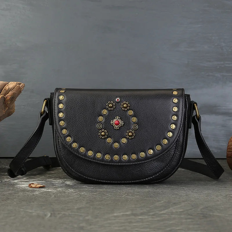 Genuine Leather Women's Saddle Bag - Retro Handmade Rivet Crossbody Bags